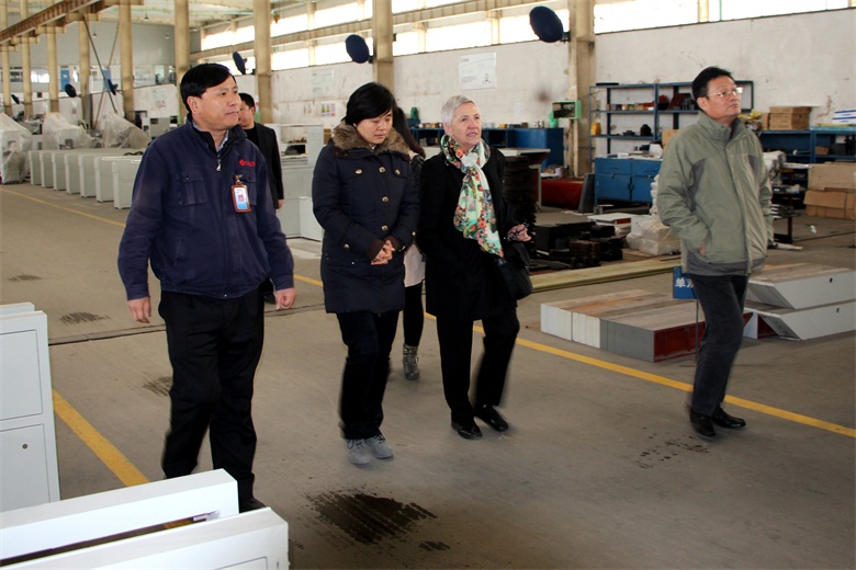 在參觀鋁機總裝車間時,Bernice Herris副校長對我公司目前處于國內領先水平的鋁機產品表示了充分肯定,并對其研發、工藝流程進行了詳細詢問,公司生產副總亓愛林對考察團提出的問題一一作了解答。