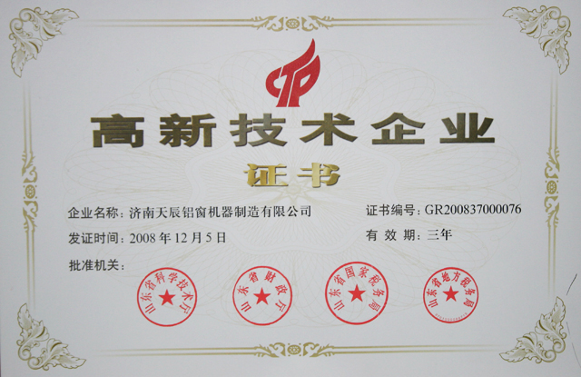 ??? 濟南高新區管委會召開了高新區2008年首批高新技術企業授牌大會,并轉發了省科技廳、財政廳、省國稅局、省地稅局的認定的通知,向區內首批高新技術企業頒發了高新技術企業證書和銅牌。天辰鋁機公司被認定位山東省2008年第一批高新技術企業。